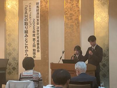 昨年12月8日(月)ホテルグランビュー高崎で行われた群馬経済同友会の次世代育成委員会の勉強会「パネルディスカッション『SAHの取り組みとこれから』」に本校と高崎女子高校、伊勢崎高校の3校が呼ばれ、ハパネルディスカッション形式で、校長先生と生徒会で3年間のSAHの取組を発表させていただきました。