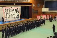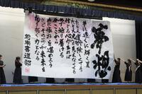次に野球応援で復活させた応援歌『闘魂』の披露。吹奏楽部の演奏に1年音楽選択の生徒が頑張って歌ってくれました。後ろでは、書道部が「闘魂」の書を披露。