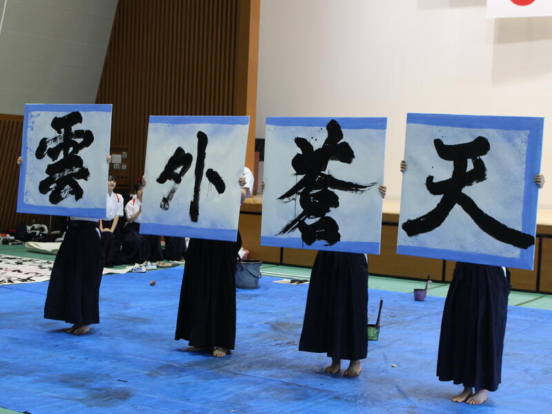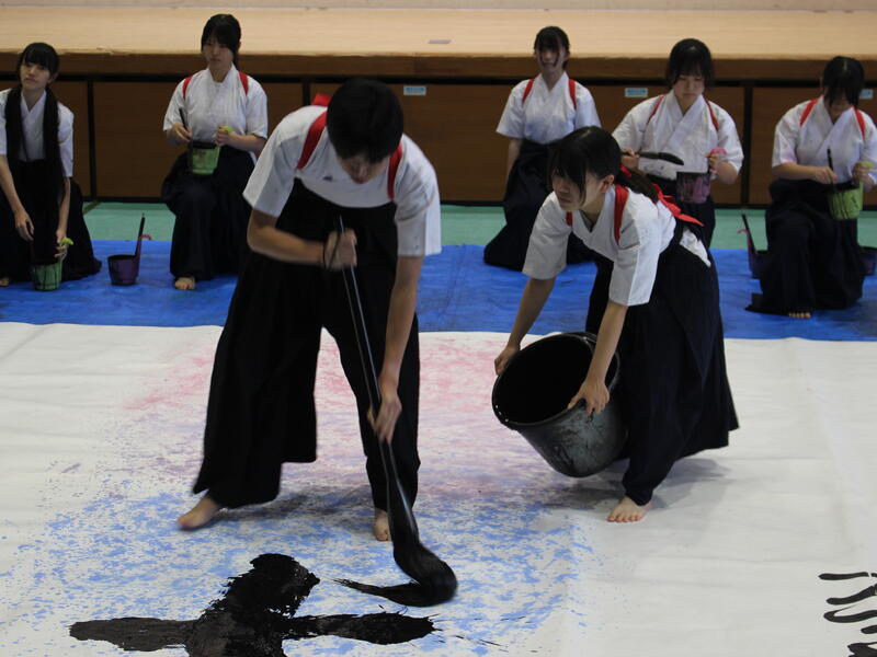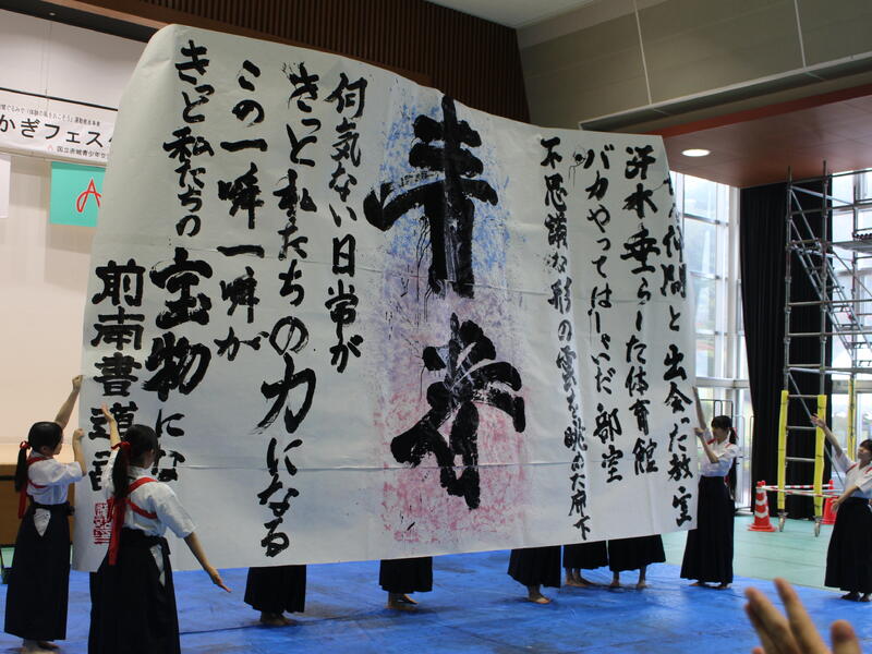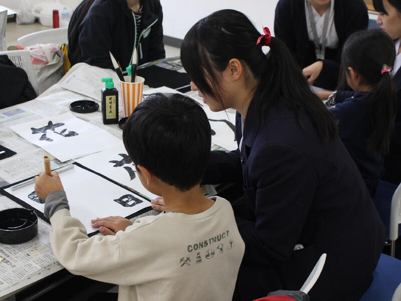 国立赤城青少年交流の家で開催された「あかぎフェスタ」に参加しました。当日は前半に書道パフォーマンス、後半に書道教室を行いました。書道パフォーマンスでは大きな紙で書いたものを2曲、4枚の板に4人で4文字熟語を書いたものを1曲披露しました。書道教室では親子連れのお客様が多数来てくださり、それぞれ思い思いの文字を半紙に書き、笑顔溢れる時間となりました。参加した生徒は普段の活動と違い、多くの子供達に筆の持ち方から文字の書き方まで教え、あっという間に時間が過ぎていきました。生徒もとても良い表情でした。