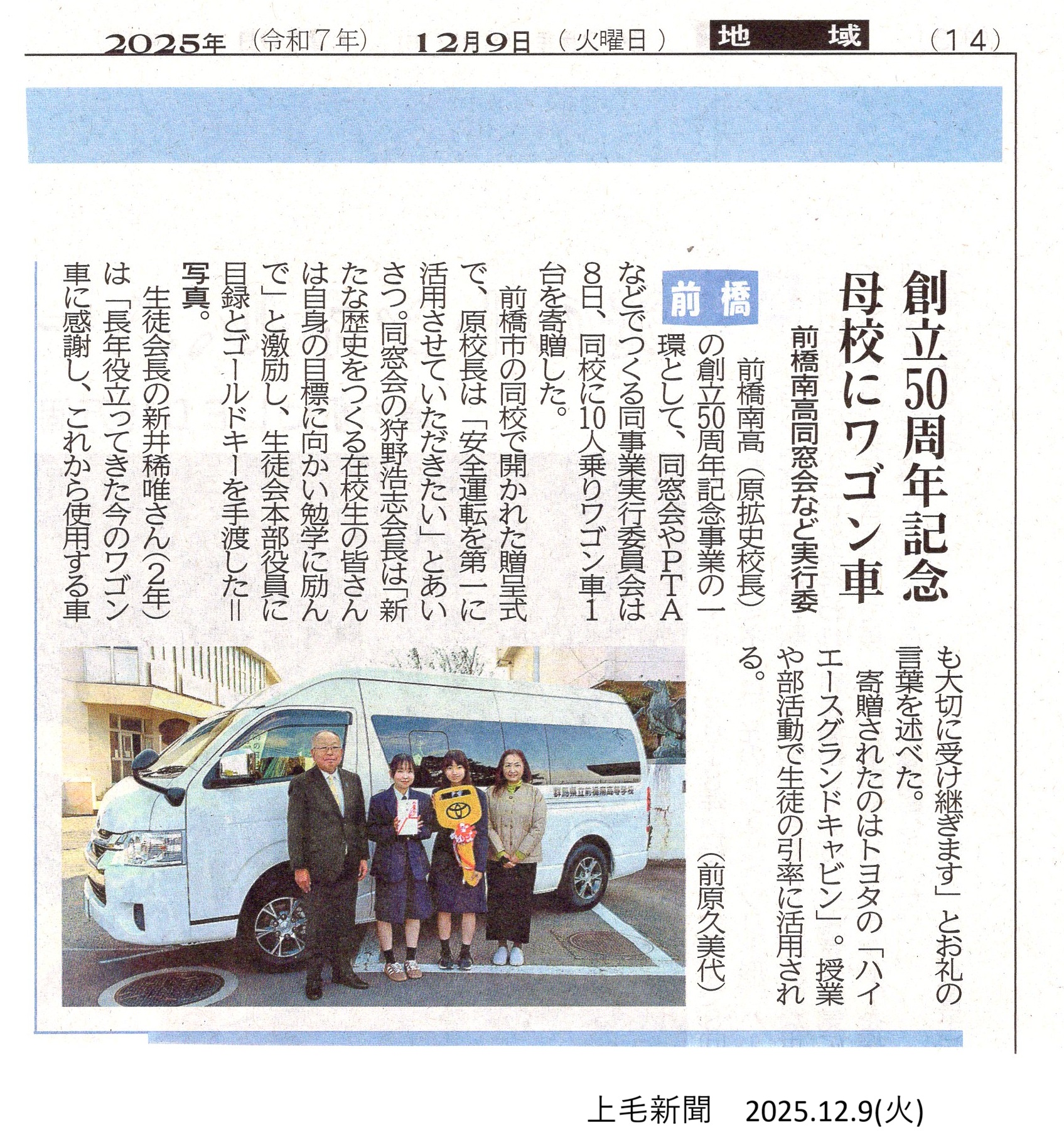 前橋南高校50周年を記念して、同窓会よりワゴン車を贈呈していただきました。