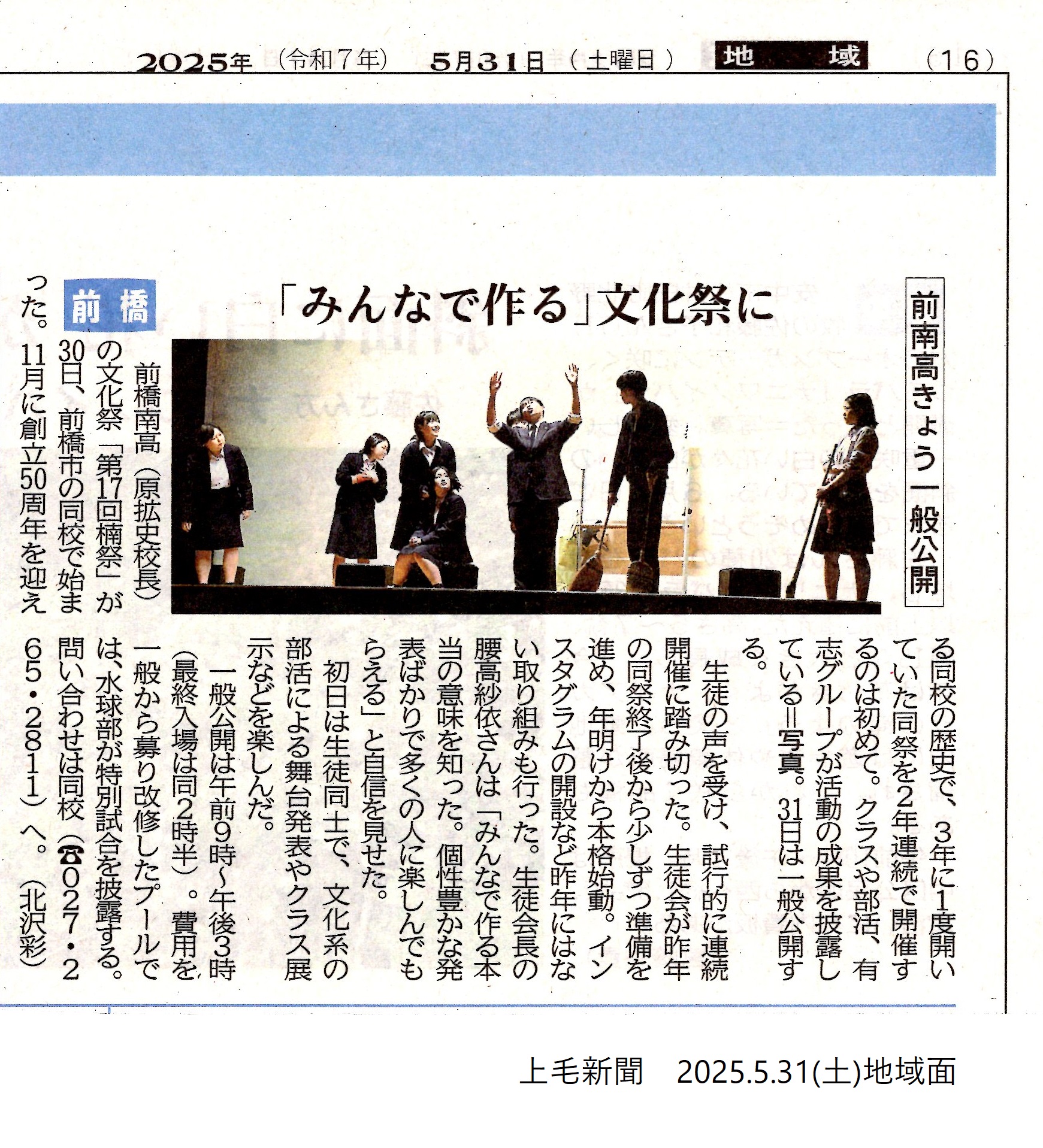 【記事更新】5/31(土)の上毛新聞に楠祭(校内発表)の様子が掲載されました(2025/5/31更新)→コチラ!